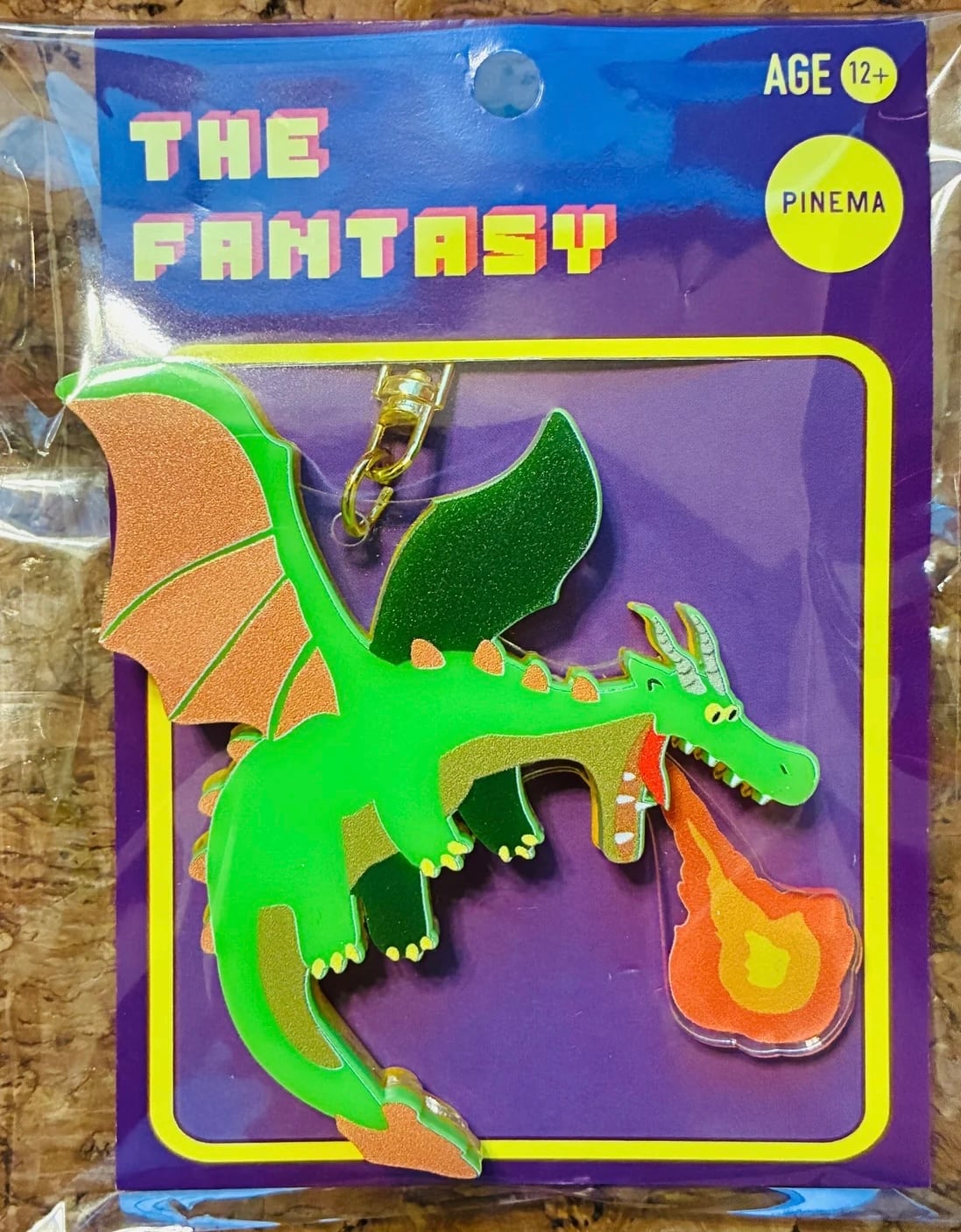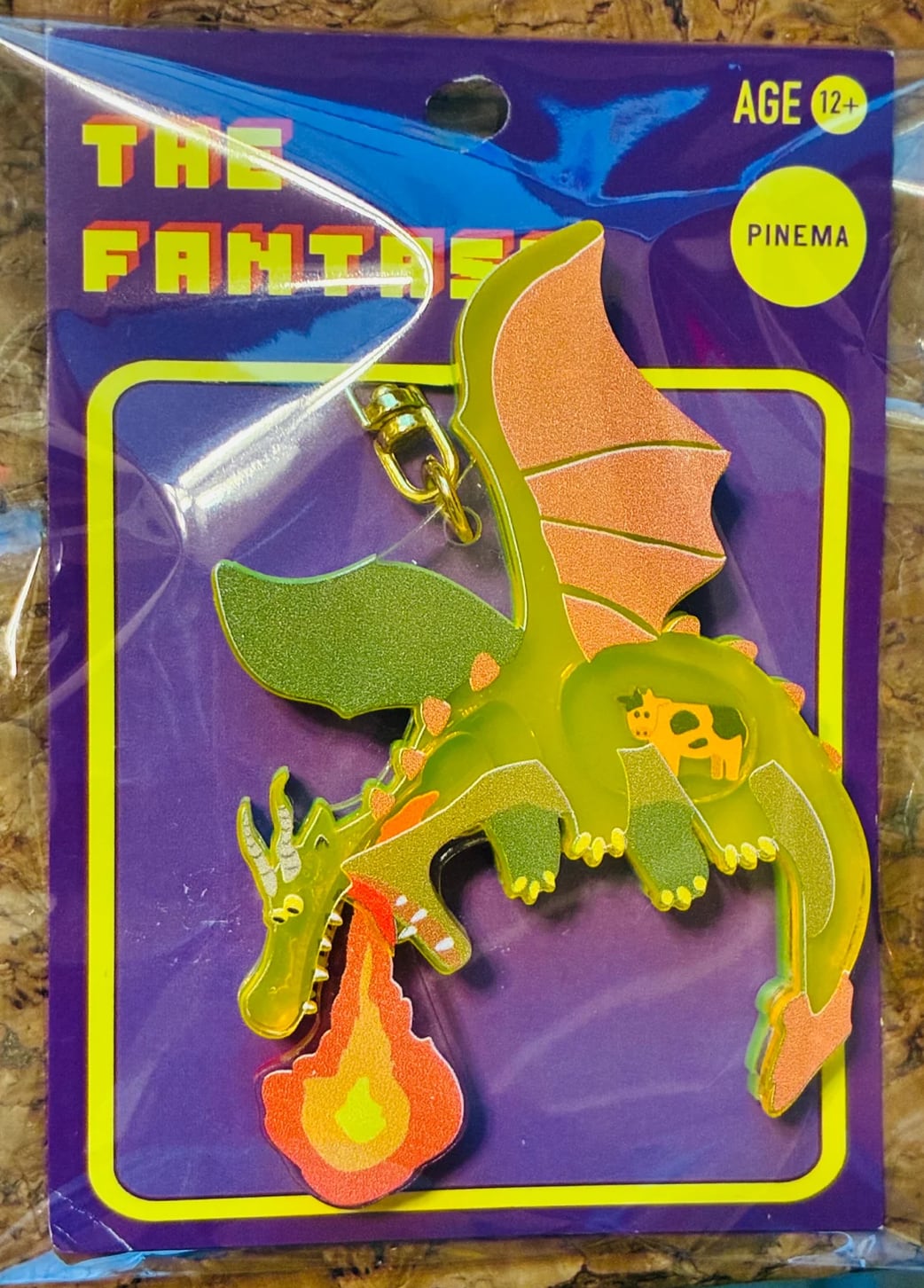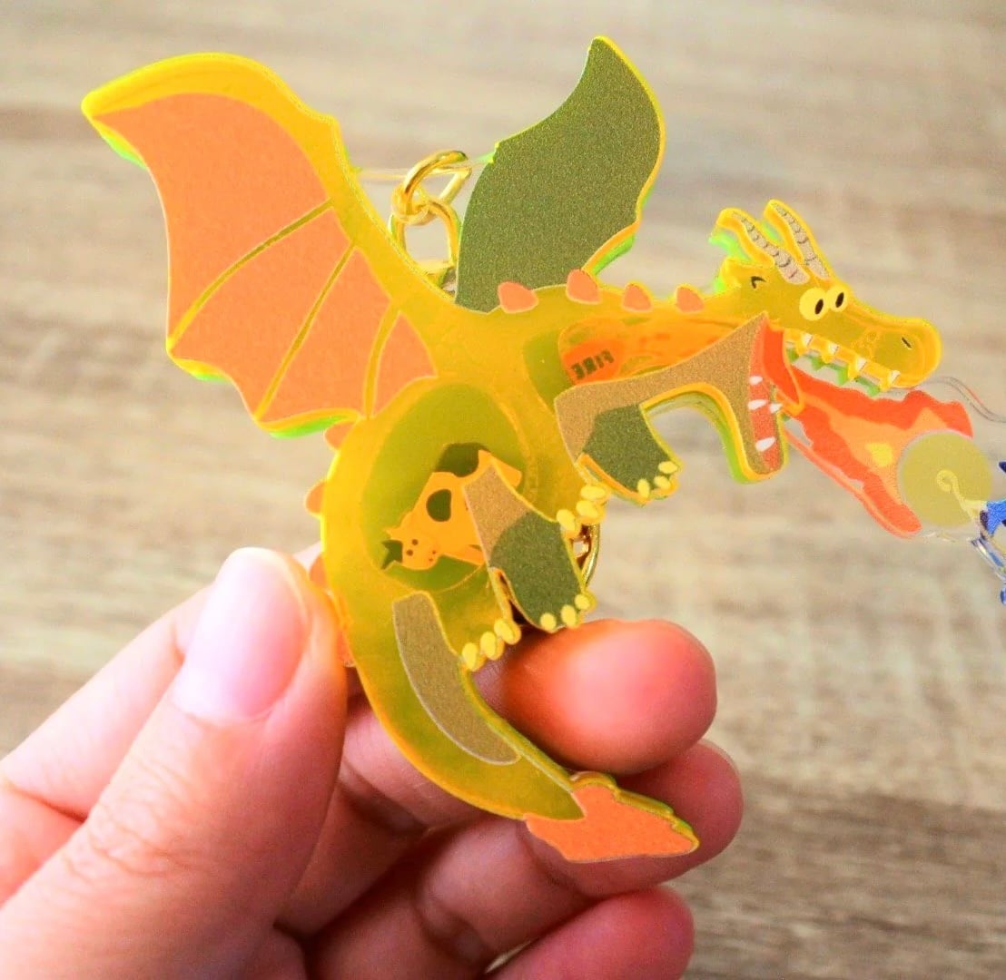 絵本やゲーム、ファンタジー映画に出てくるような火を吹くドラゴンのキーリング。街や農園を襲い人々を襲うような緊迫のシーンをコミカルなキーリングにしました!よく見ると裏面には牛が食べられています‥